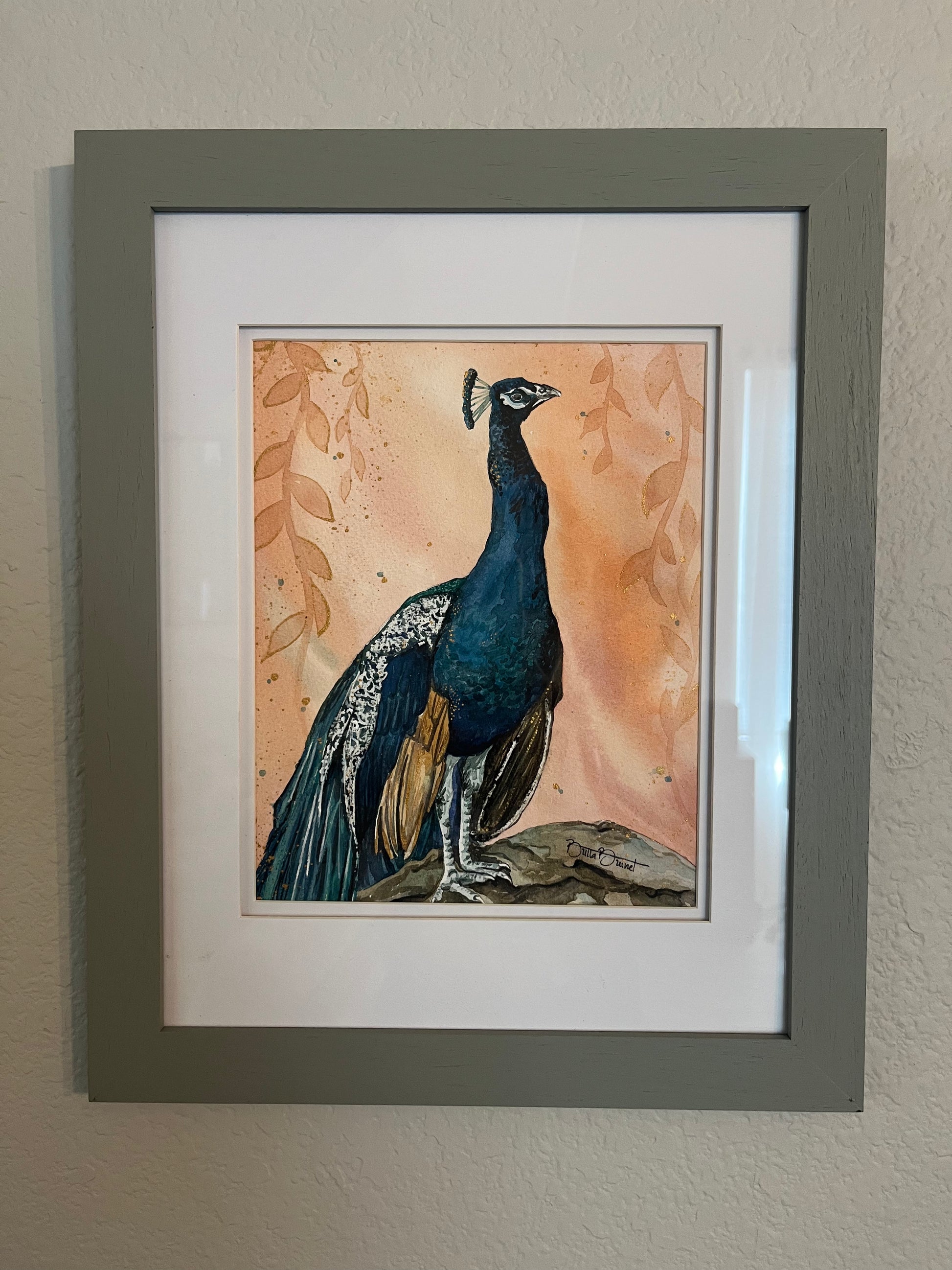 A graceful watercolor peacock gazes into the distance, its vibrant feathers contrasted against a warm, glowing orange background.