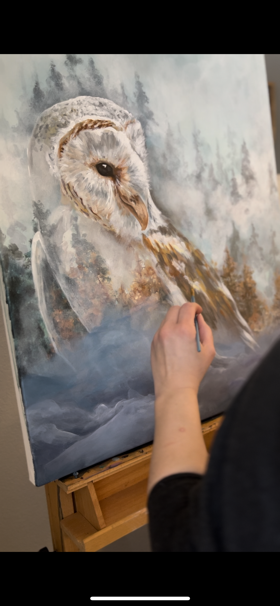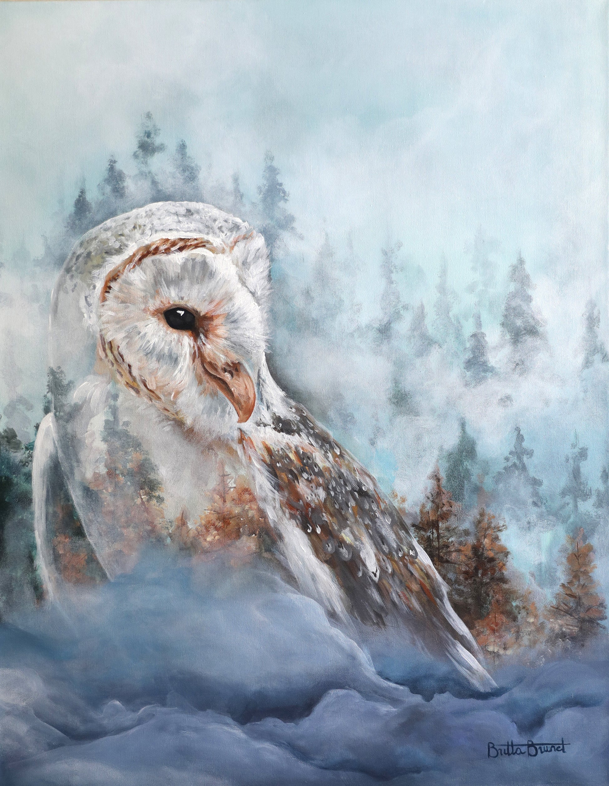 A soft, gentle owl amongst the mist with a double exposed photo of trees crossing over from fall to winter.