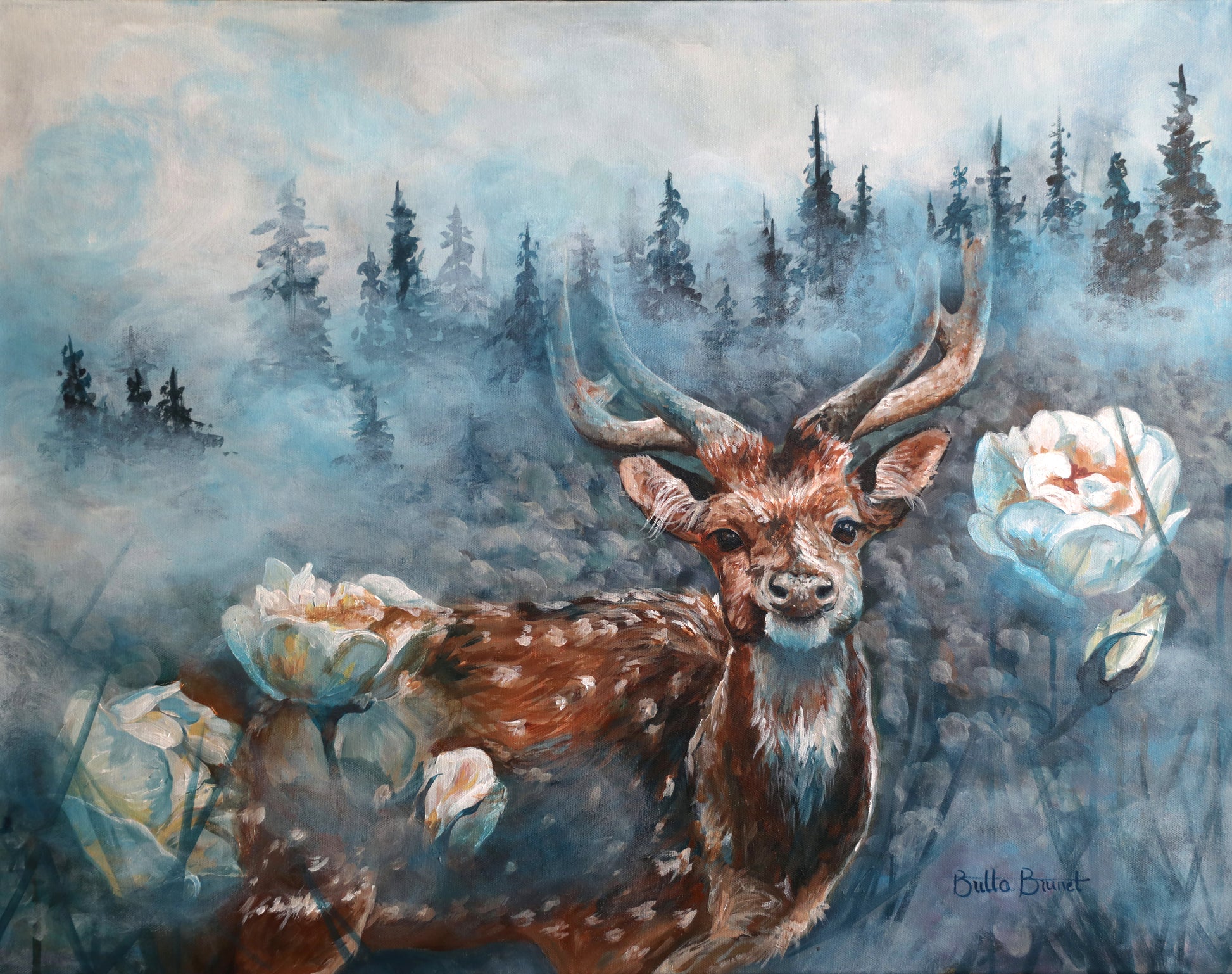 A deer hiding in the mist amongst brush and burrow, with double exposure of the forest trees.